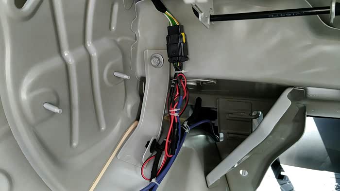 打开后备箱,拆开衬板,很简单,不用我教,如果这里都打不开,不建议自己改装,大家就不用拆后备箱盖上的衬板了,我已经找到线了,在这里接就可以,和后备箱盖上的线是通的。