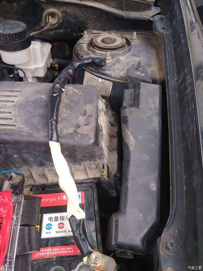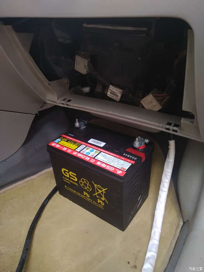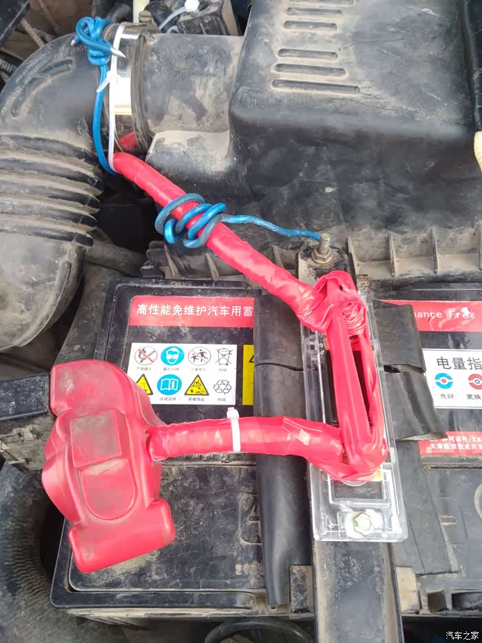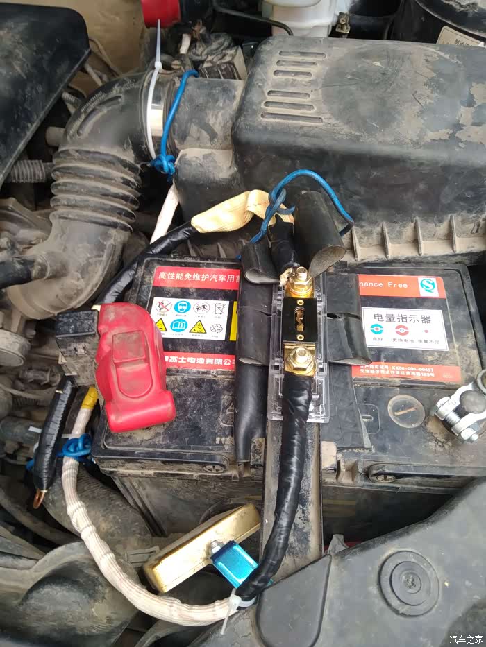 今年新买的电瓶和从发动机舱引来的导线。