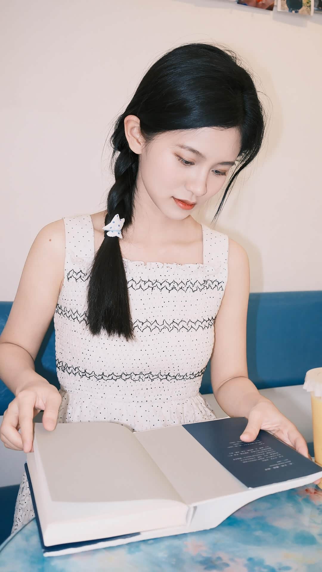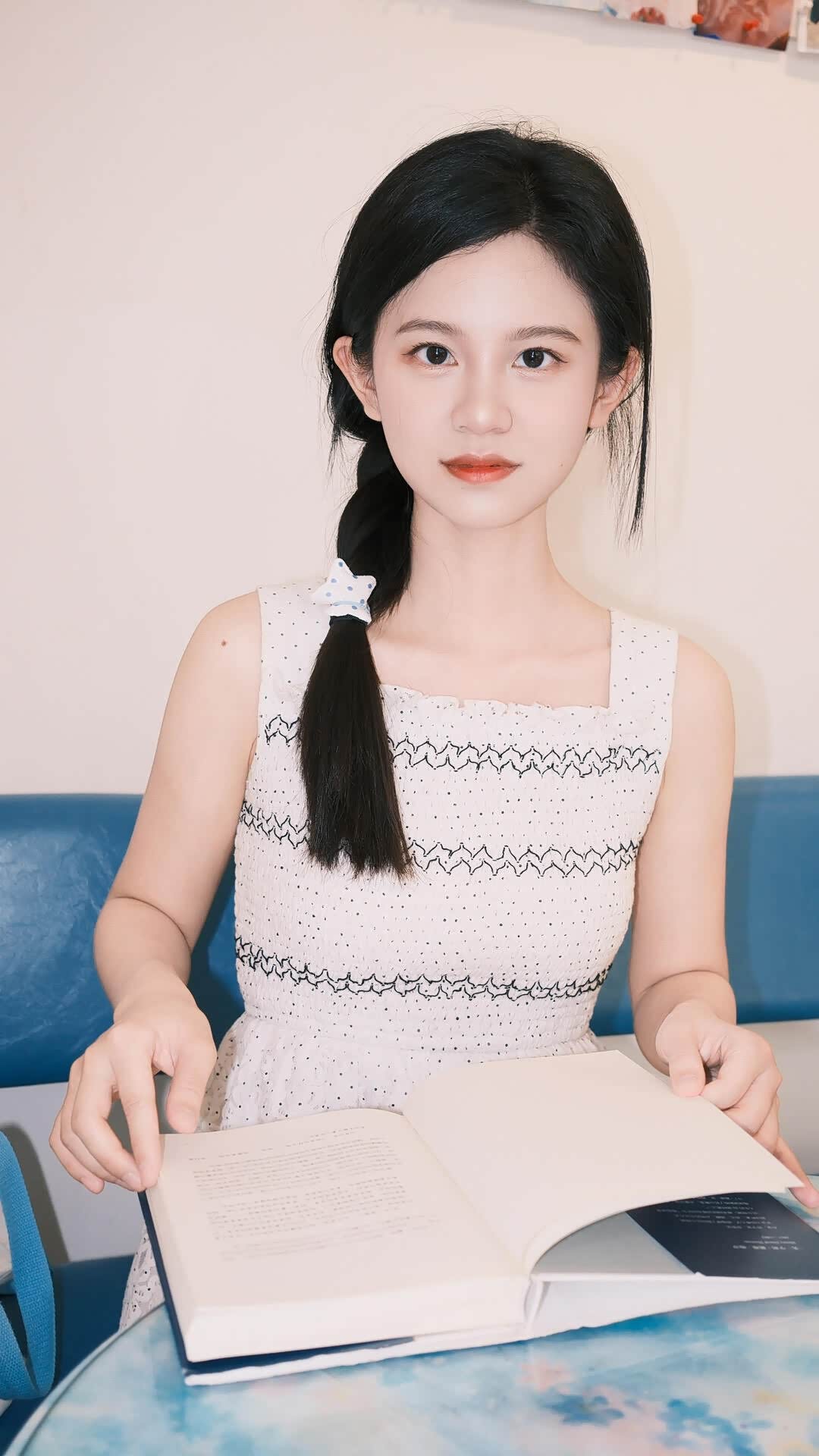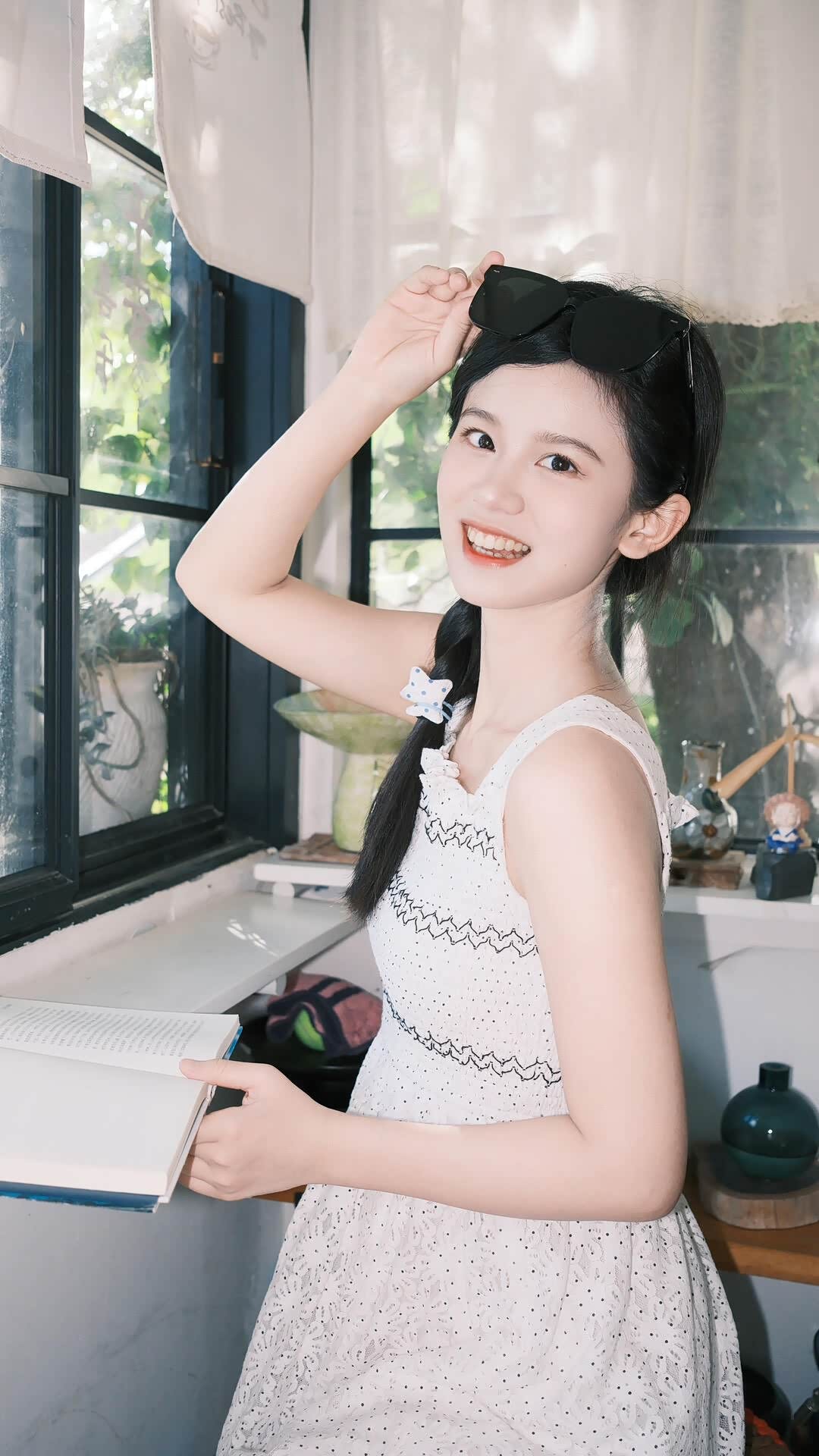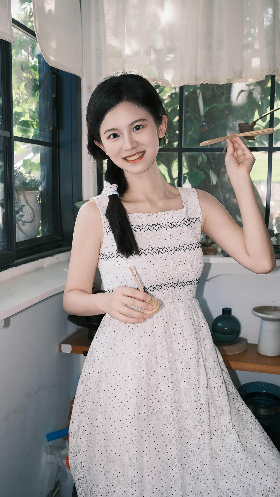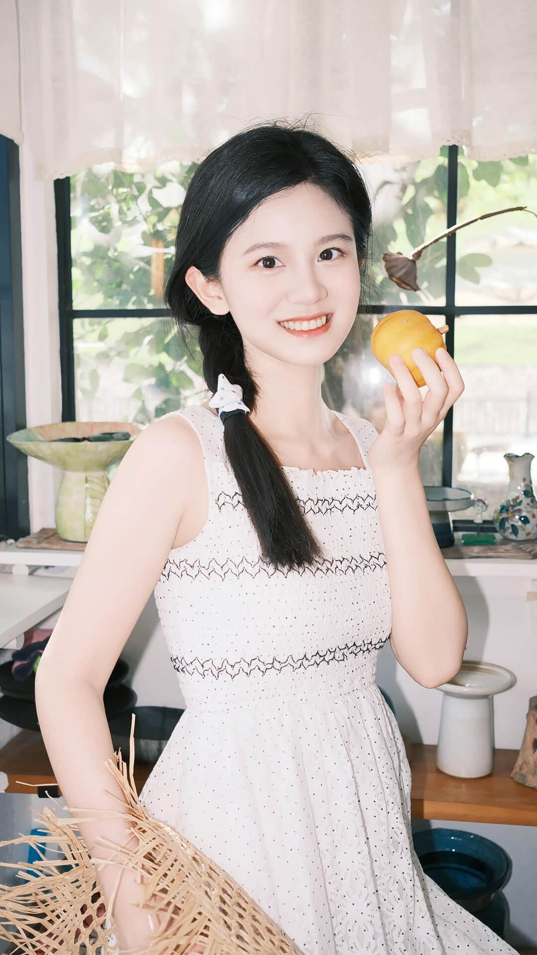 - 陶艺工作室:这是个意外之喜。在郊野附近,我们发现了一间充满手作温度的陶艺工作室。暖黄的光线、陈列的陶艺器皿、窗边的绿植,营造出“夏野里的秘密小窝”的氛围。小冉拿着小南瓜摆件,草帽被随意地拎在手里,麻花辫上的星星发圈可爱又精致,画面充满生活化的松弛感,像是少女在夏野探险后,躲进小屋里偷闲的片刻。