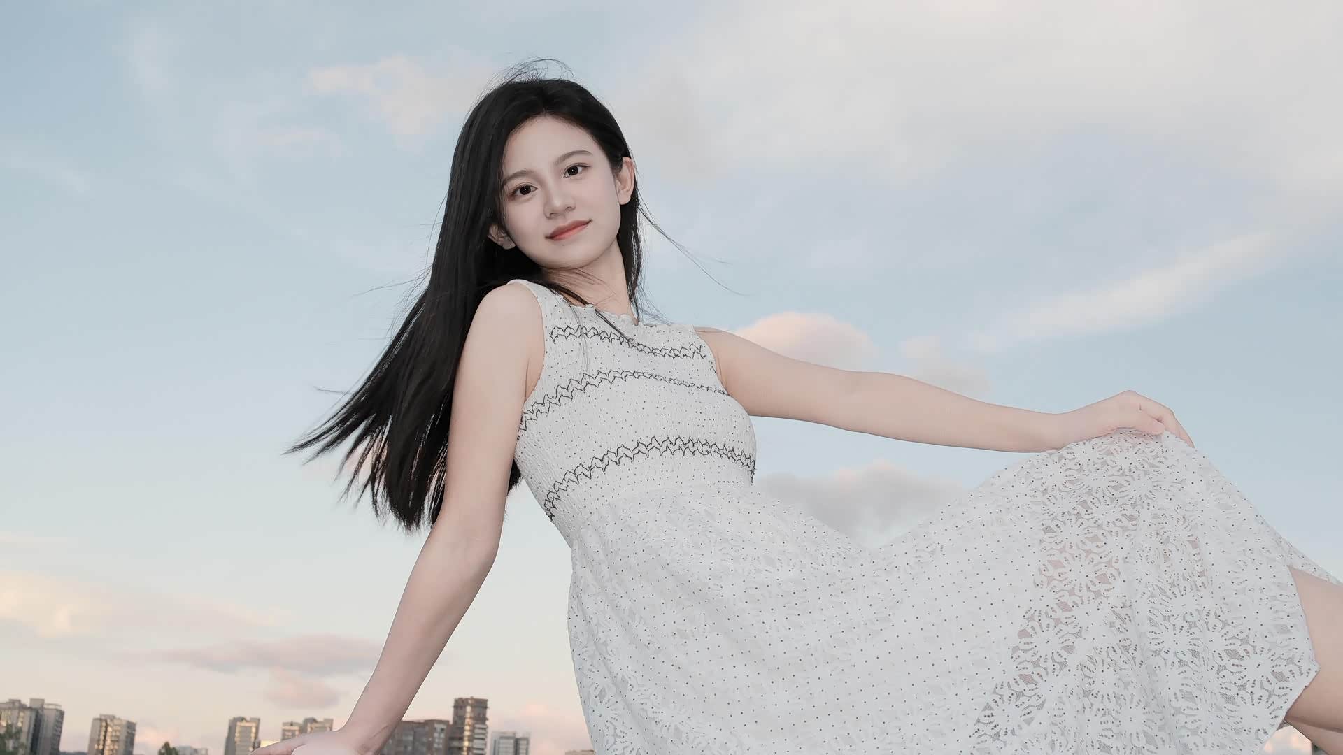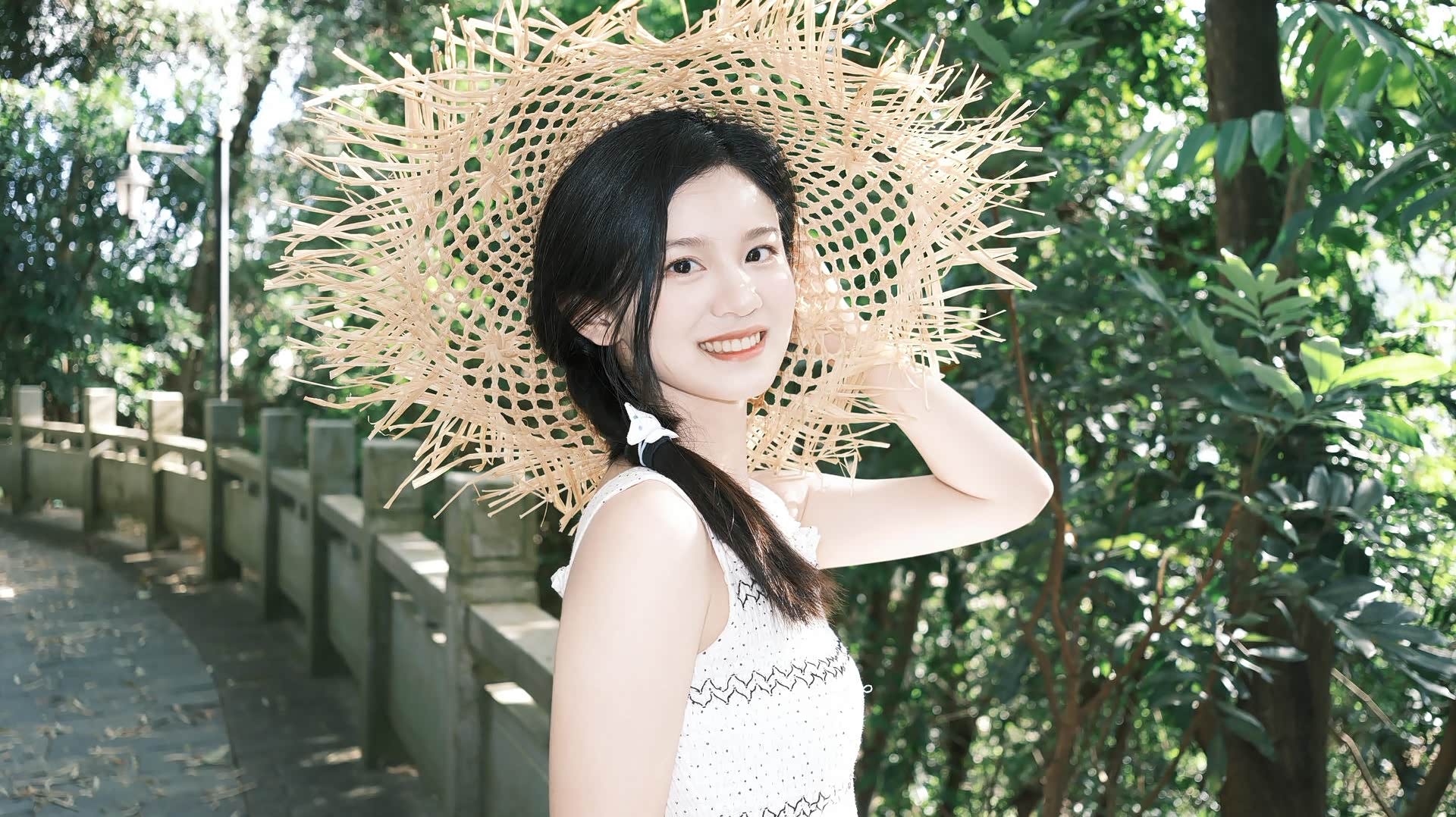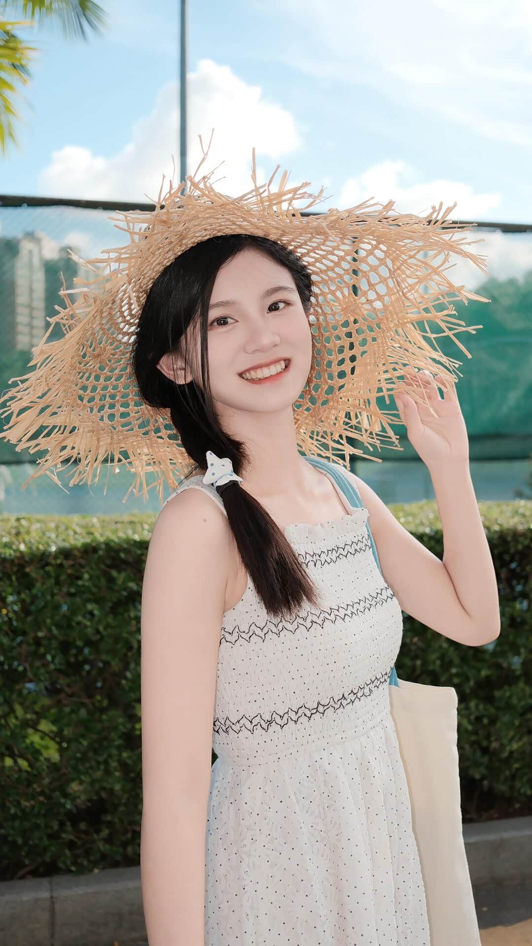 - 网球场旁的绿篱:这里是城市的印记。绿色的篱墙整齐划一,与背景的网球场、高楼形成秩序感,而小冉戴着草帽,扎着俏皮的单侧麻花辫,穿着带有波点与蕾丝的白裙,像一阵闯入规则世界的“野风”,这种反差让画面充满故事感——即使身处城市的框架里,少女的自由也能破土而出。