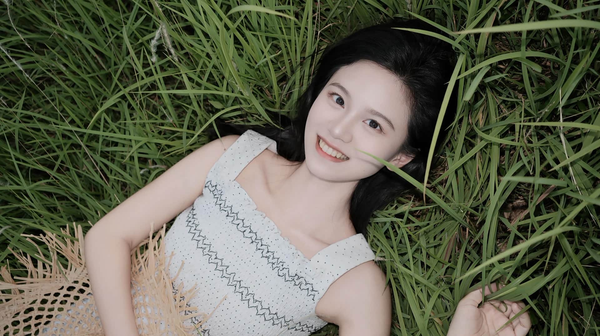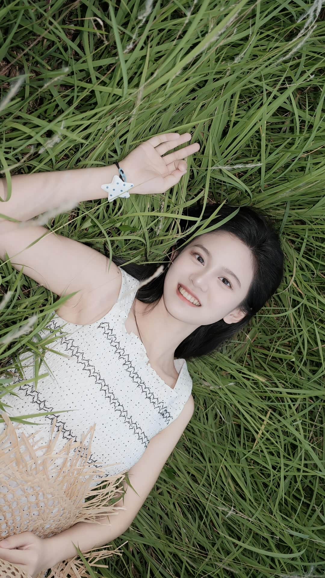 - 草甸:这片草甸是核心场景,齐腰的草叶带着野性的张力,风吹过时,白色的草穗像细碎的雪。我们让小冉或躺或坐,把自己埋进草里,草叶的线条成为天然的前景,既增加了画面的层次,又让她仿佛是从草间“长”出来的精灵。尤其是俯拍的视角,草帽半掩在草丛,小冉的笑容明媚又带着几分娇憨,那一刻,她就是夏野里最生动的注脚。