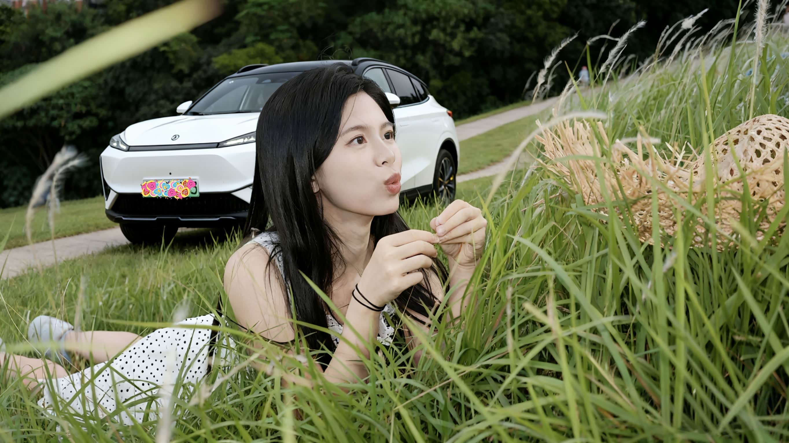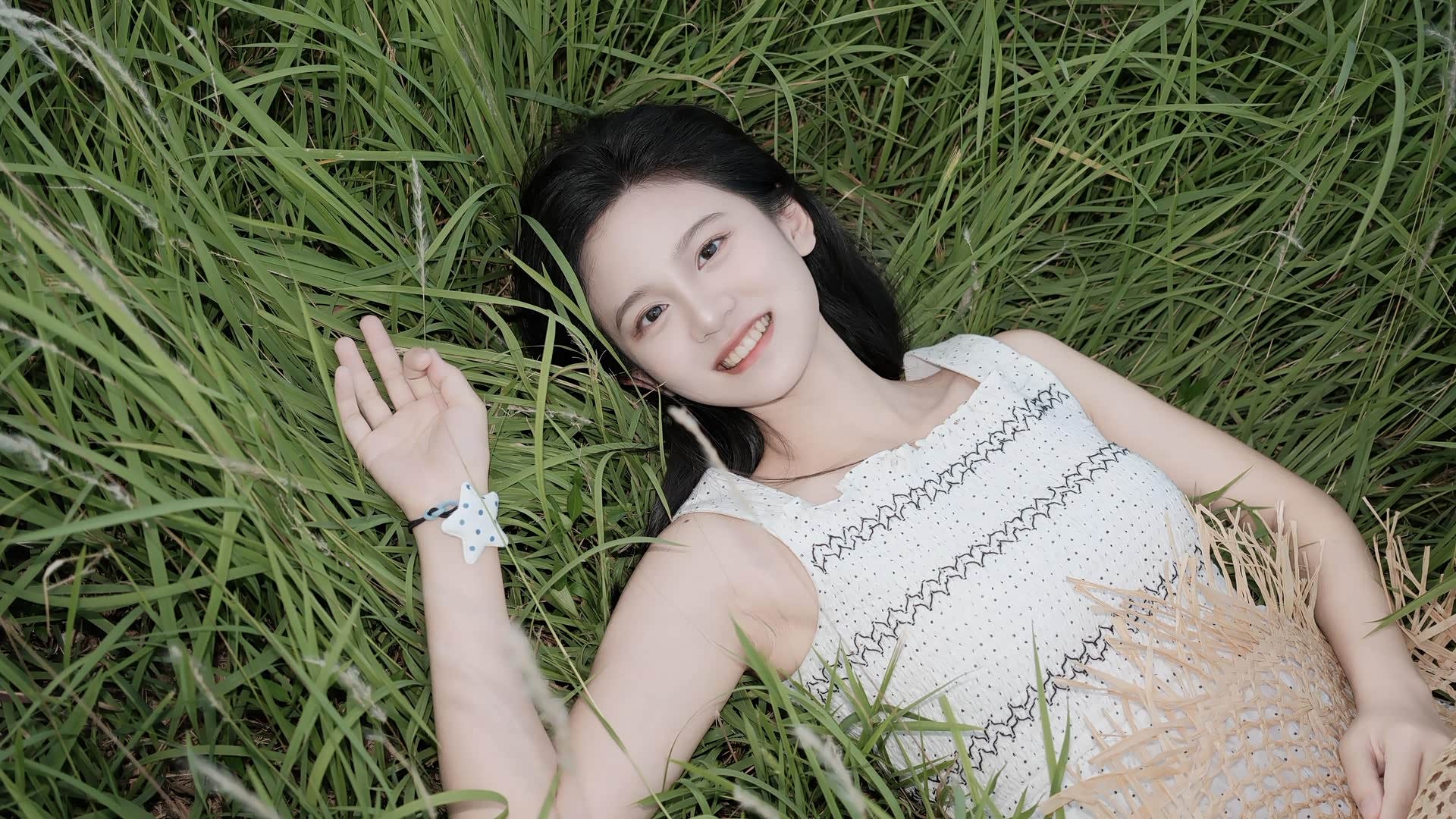 服装选择了白色蕾丝波点连衣裙,白色是夏天的底色,蕾丝与波点则为“少女感”注入浪漫与俏皮;编织草帽是贯穿始终的道具,它既是遮阳的实用物,也是“野趣”的符号,戴在头上、拿在手里、丢在草间,每一种姿态都有不同的情绪;单侧麻花辫与星星发圈,则在“长发披肩”的基础上增加了造型的层次,让少女的活泼感更具体。