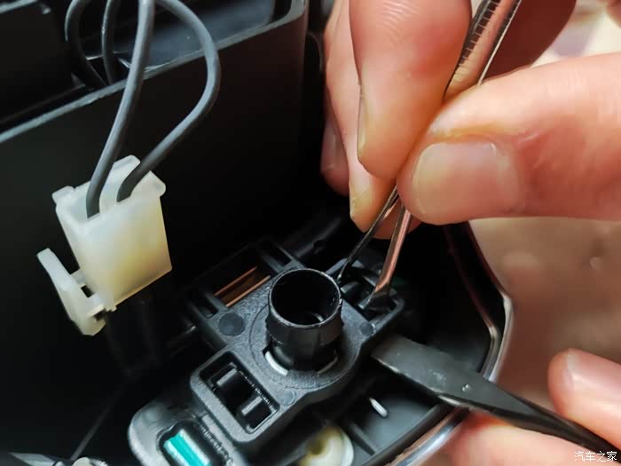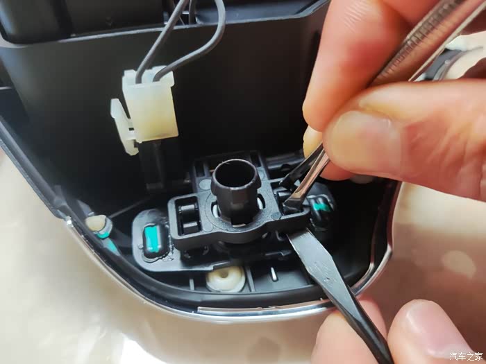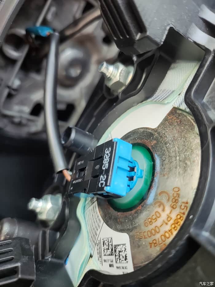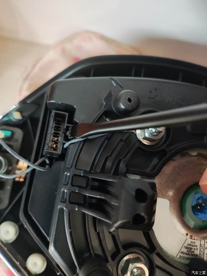 蓝色左右扭动,拔出,白色是气囊线用一字螺丝刀,压住卡扣,拔出。