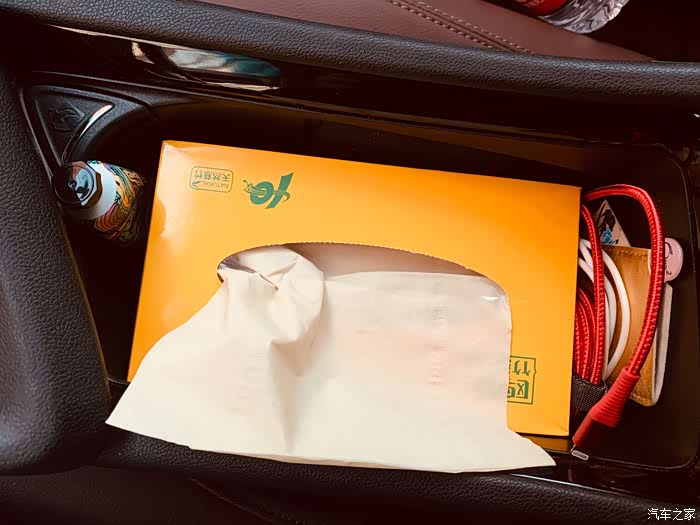 中央储物格。下面设计用来放纸巾的空间我放了好多不常用的东西,上面的空间就用来放纸巾好了。