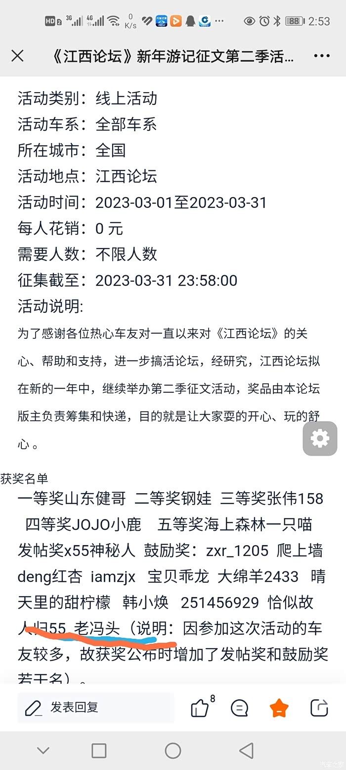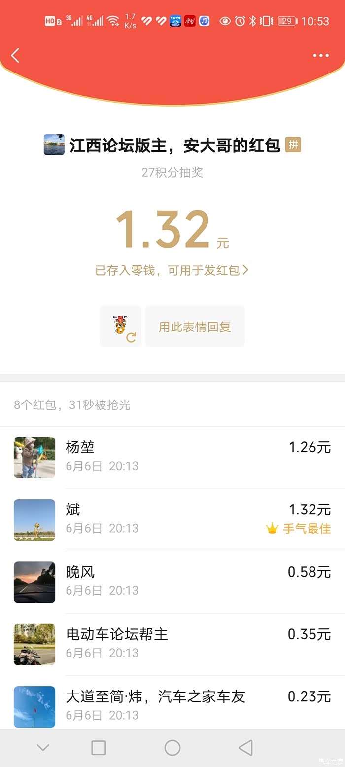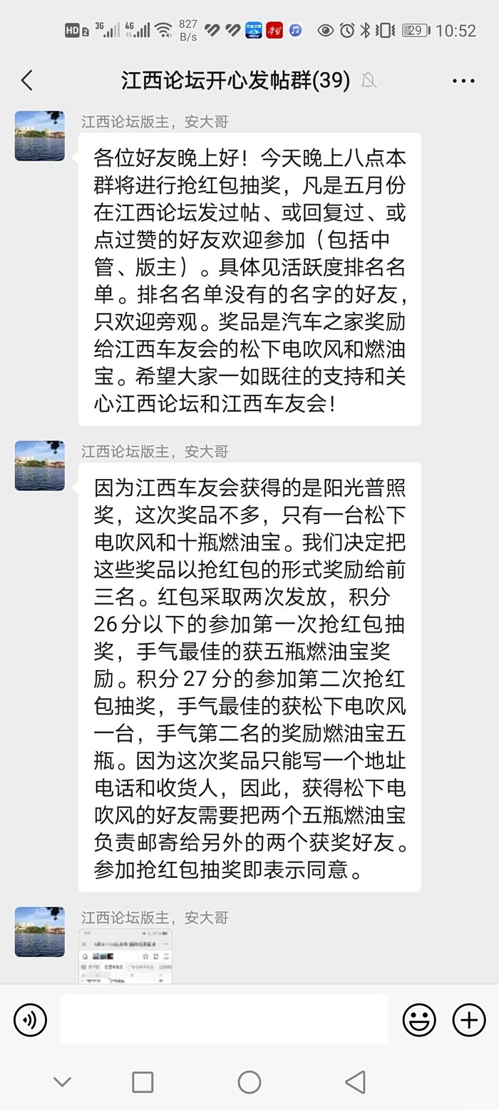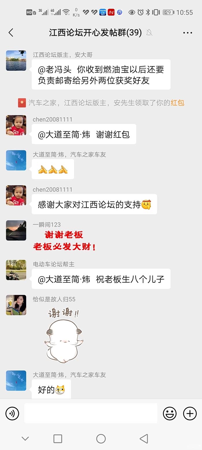 因为自己喜欢车子,所以通过汽车之家的活动可以帮助我记录一下我和车子的生活,而在众多活动当中,我觉得最让我感动,最让我高兴的莫过是我参加江西论坛安版主搞的三月份的活动,(当然也是多亏了我的车友老铁电瓶车论坛版主给我的推荐参加的)自己积极参加的活动也写了几篇活动的作业,当然也收到了各位车友的关注和鼓励,得到了安版主的肯定,最终也获得了安版主的奖励,也有资格参加江西论坛微信群里的抽奖活动,安版主把自己作为版主所获得的汽车之家的奖励,通过微信群里几位有资格参加活动的车友聚集到一起,采用抢红包最佳的方式激励我们,自己非常有幸的获得了第一名,安版主就将自己获得的电吹风奖励给我,这是我人生中获得的最高的奖励,让我非常的高兴,自己觉得也非常的幸运,感谢安版主!