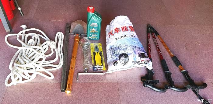 小心驶得万年船。因为从来没有过 冬季自驾冰雪路面的经验,所以出发前多准备了些物品,以备路上自救:防滑链、牵引绳、铲子、简单工具、机油。由于要进西藏高原,一路上,许多垭口的海拔将超过4500米!而且几个住宿地的海拔也超过3000米,由于车上有俩千金小公主(丁丁6岁,当当2岁),还特意准备了一瓶35公斤重的医用专业氧气和呼吸器(是医院用的大蓝瓶的那种氧气哦),成年人可以不间断呼吸36小时,儿童则可以不间断呼吸48小时!其实,铲子(已经开刃)、钢管主要是用来防身的,另外我们还带了两把“藏刀”!没法子,谁叫咱非要单车走藏区呢,而且还带着老婆孩子……不怕一万,只怕万一,如果路遇矛盾和纠纷,遇上不讲理的人,也只能出手自救啦