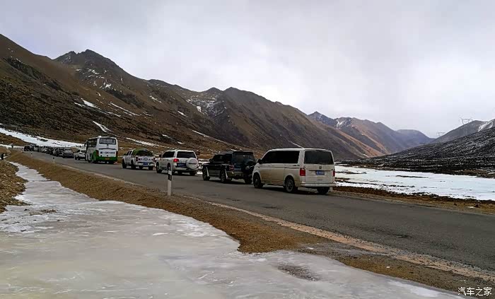 这次堵路的是这些“胆大过人”的低底盘两驱车。这个季节开辆两驱轿车就敢走川藏线,你以为是去北京天安门逛故宫呢?!这也太不尊重青藏高原啦。这段冰冻路段长达300米,靠山体一侧的车道形成了厚达半米的冰冻层,而且它不是平面,是斜面呀!几辆路巡、霸道跃跃欲试,谁也不敢上去呀,万一上去了沿斜面滑下来,丢人不要紧,撞上另外一侧的车子咱整呀?!两驱车进去就动不了,底盘低的直接托底四轮悬空……