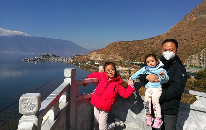 隔壁老胡和丁丁、当当于洱海观景台留影。隔壁老胡除了痛风,还有“季节性鼻窦炎”呀。原计划约上几个大老爷们一起出发的,路上有人帮着推车铲雪……这下好了,丁丁、当当一路上就指望你俩小丫头啦