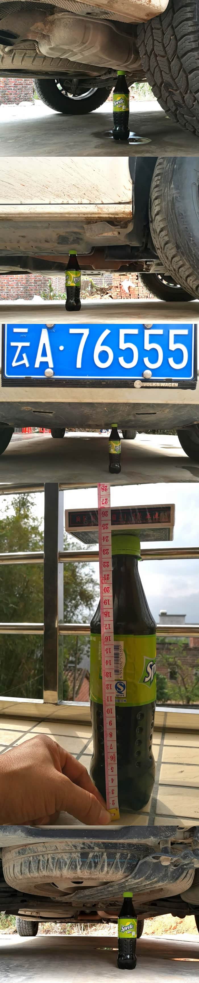 大家最关心的问题来了:迈特威的底盘 到底有多高?其实我也不是知道。购车前 我查完了说明书、问断了百度云,连4S店的销售都说不清楚!如果有知道具体数字的,可以跟大家分享一下啊。中午停车吃饭时 闲来无事,顺手用这只“小瓶雪碧” , 实测了一下 迈特威底盘 前、后、左、右 四个方向的高度……天那?!这只“小瓶雪碧” 足足有245mm高呀!我的 大白 由于更换了“235/60 RI7” 固铂越野A/T3 轮胎,它目前的底盘高度 比原车车胎 的实际底盘 升高了13mm……那么用 245mm-13mm=232mm!这就是迈特威 原车原胎 目测条件下的 底盘高度。这个数字只是本人随手 目测 得出的,并不代表 大众汽车 官方公布的数字哦,仅供大家参考而已。很多时候 ,简单粗暴,就是比 含糊遮掩 更给力!大众汽车,你就公布一下 迈特威的 底盘最小离地间隙 又何防?难不成 你担心这个数字 会输给 五菱宏光