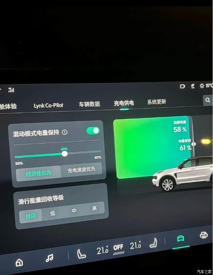 先介绍一下我的基本情况吧。家里有地库有私桩,每天上下班往返一共是35公里,工作日周一到周五一般都是用纯电模式开,每天晚上到家插枪充电。出去玩距离远一点如果不超过100公里,那我就先用纯电模式把电量开到20%左右然后开启电量保持切混动,如果超100公里那就直接用混动开,电量保持设置60%左右以便应对中途遇到堵车的情况。