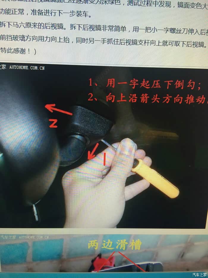 4、借用坛友拆除原有后视镜的图片,用力时,小心轻来,别弄坏了前档玻璃;
