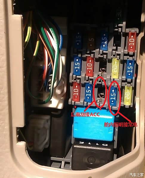 18、保险盒接电示意图,右边红圈中对应上图中文说明,为后雨刮器,其余几个空的仔细观察了下,都没铜片触点,因此都不带电,只有这个我用电笔测量了,下面为进电,原来准备从点烟器取电的,但点烟器也是下面为进电,而点烟器上部有个突出的卡扣,不能接线朝上方向插进去,只有换了这个插口,这个插口下面有铜片触点,上面没有,并且下面铜片有电,正好利用上了;