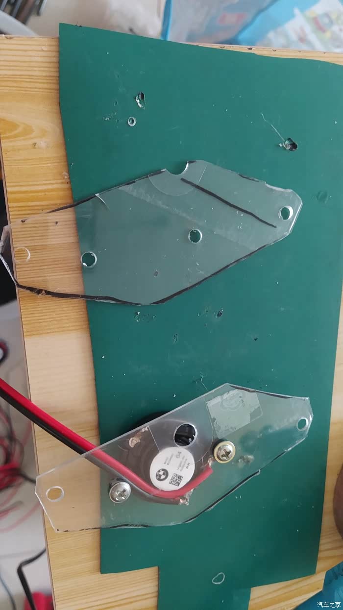 安装后门高音喇叭的时候,提前了解到没有喇叭支架,就提前在亚克力酒盒上割下两块板,卸掉装饰板后用亚克力板儿往高音位置一比,用记号笔画一个合适的轮廓,用烙铁切割成型,一个简易的高音支架就做好了。