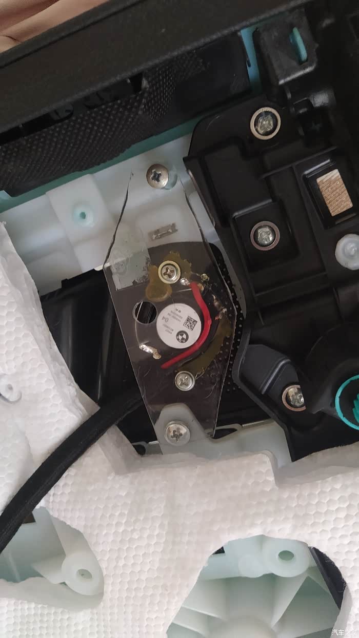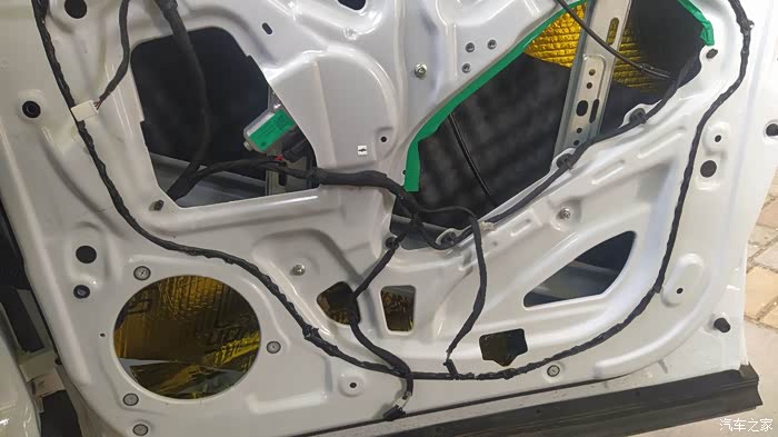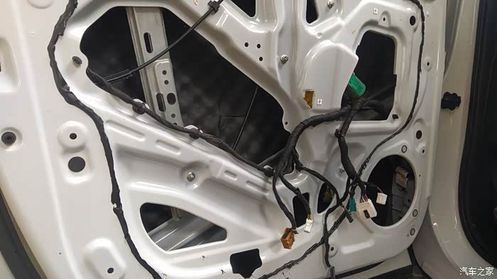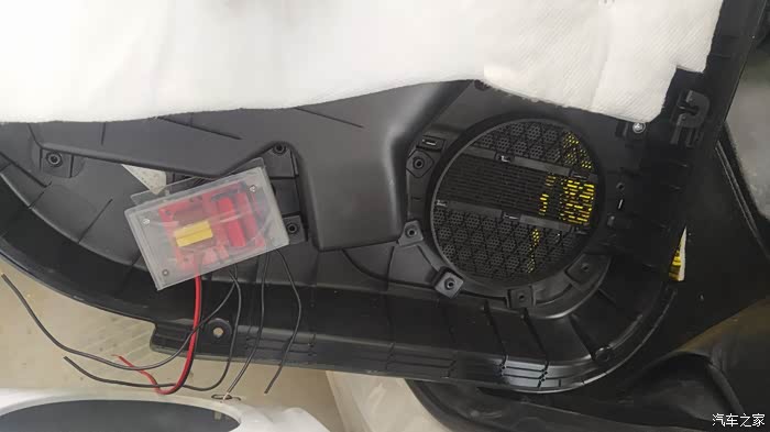 前门的两个分频器分别装到了主副驾中控控下面(也就是放脚的地方上面),后门的本来准备装到门板上,卸开后门后,发现装饰板和门板的契合度很高,基本上没有什么缝隙,基本上光吸音棉就填满了。经过仔细观察,发现幸好装饰板上喇叭罩旁边有个空腔位置,要不然分频器走线装到车内就麻烦了。