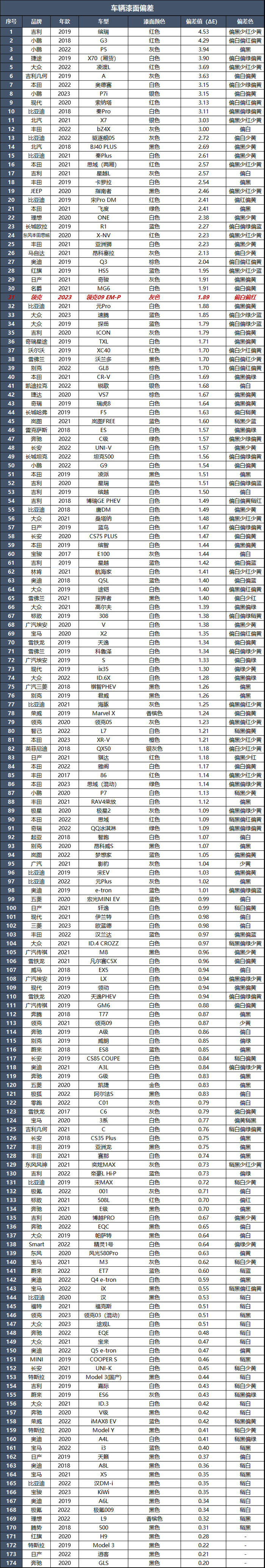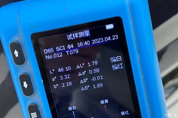经过测试,最大色差值位于前保险杠处,色差值为1.89ΔE,比基准点偏白偏红。从数值上来看,这辆车的喷漆工艺质量不错。