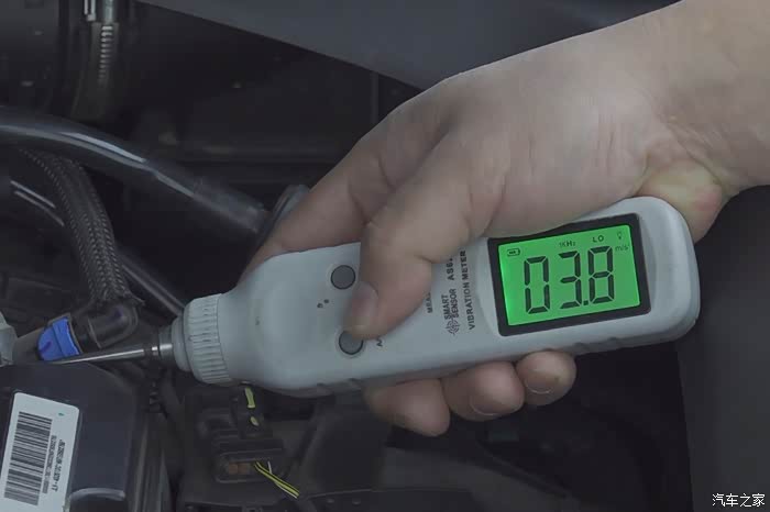 测试方法:水温正常后,关掉空调,在怠速状态下,使用测振仪垂直曲轴方向,将探针接触发动机金属机体中间的最高位置,测量发动机振动加速度值,数值越低,表明振动越小。