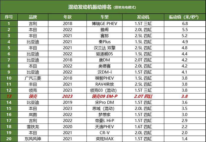 这辆领克09 EM-P版搭载了一台2.0T四缸发动机,强制启动后,怠速振动数值为3.8米/秒²,相对偏大。