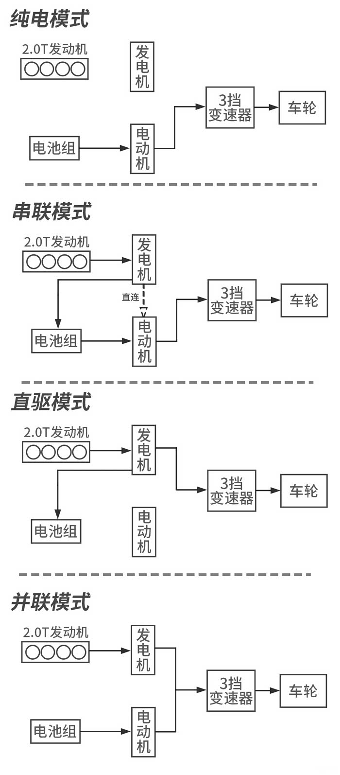 这辆车的发动机和电动机可以纯电、直驱、并联和串联,通过3档变速器驱动车轮。这样就摆脱了混动过分依靠电力和高速费油的缺点,因此,超过本田和一众以此为基础的那些自主品牌。