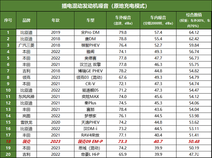 测试方法:发动机完全热机,水温正常,关闭空调,正常怠速下进行测试;打开发动机盖、取下引擎罩,在距离发动机机体上方20厘米处,进行噪音采集,取平均值,为车外发动机噪音数值(dBa);在车内,将车窗关闭,发动机空载运转2000转/分,将噪音仪置于方向盘正上方,取平均值,为车内发动机噪音(dBa)数值。并且以车内30%,车外70%的权重进行综合计算。
