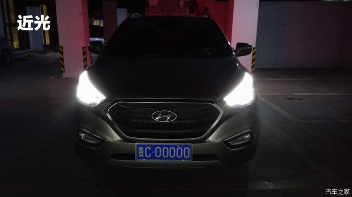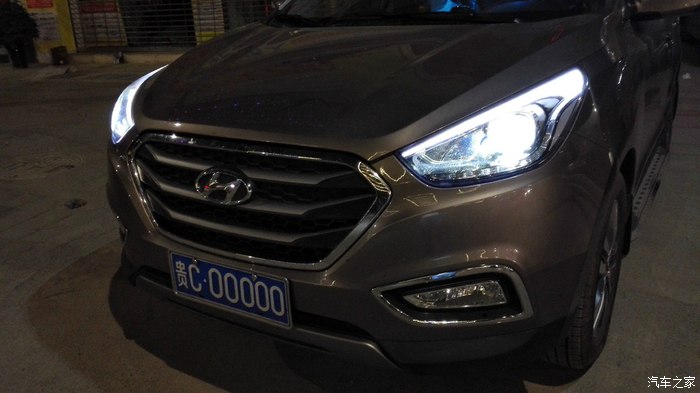 安装下来效果还是过得去,具体看下面的图。比原车的卤素灯亮一些(也不知道是不是心理作用),不能跟疝气灯比,但是功耗一下子就降了好多,应该可以对13款ix35亏电起点改善作用(LED灯单个只有30W,原车的卤素灯单个貌似是55W)。温度方面也基本上可以放心,昨天开了20分钟后用手摸散热片,温度大概在50-70度之间,烫手,但是还是能接受。同时,白光配13/15款ix35的大灯总成比黄光拉风多了,**一下子又提升了。