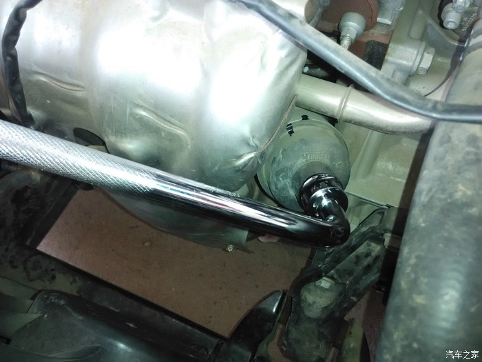 上面是机滤放大图,红圈内就是。把它拧下来就行了。对,就是红圈内的这颗螺丝,用套筒扳手,套筒型号是24mm的。普通梅花扳手行不行?答:好像不行。主要是力量不够。下面你会发现,我用的套筒杆太短,我还加了一根管子,延长了力臂,这样就省力了。绿圈里是自己做的一个记号,黑漆描的。你要有记号笔最好,没有的话随便找个东东划一下。据说这颗螺丝要拧到13牛米的力,我没有扭力扳手,这样做好记号,回头还扳到这里不就行了吗。事实证明可以的。(ps,1.6l的英朗机滤打开机舱盖就可以看到,带t的英朗机滤好像在车底)
