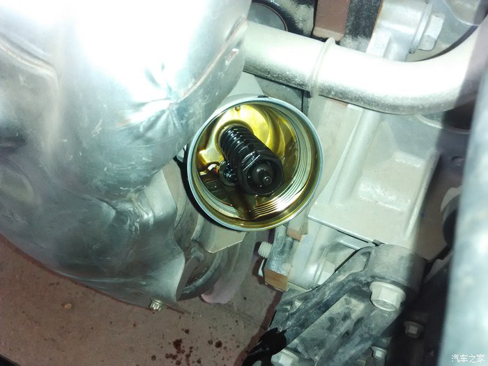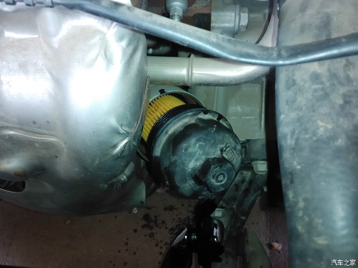先直接插进去。看到了吗?拆机滤时流出的废机油,把车弄脏了哦。再用手拧进去,拧不动的时候上家伙。注意,大概也是扳手拧两整圈就到了原标志处。