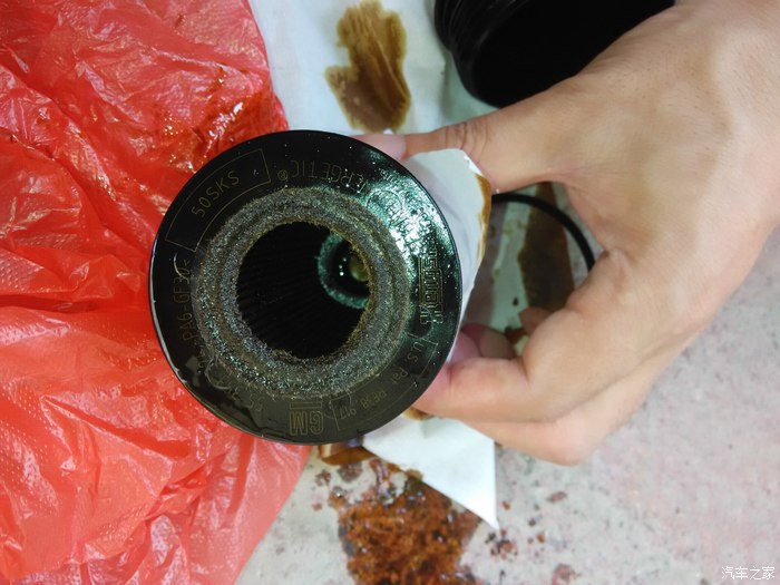 我连接好的套筒,够长了吧。连接的那根管子眼尖的朋友应该知道,就是随车工具里的扳手哦。(ps,随车工具在后备箱内,拿出后备箱的垫子,会看到一个备胎,这东东就在备胎附近。) 看见了吗,那个记号?对了是黑漆描的,分开了吧,呵呵。用扳手整整转了两整圈,然后就可以用手拧了。 2.更换新机滤。 这是旧的机滤,不知是什么牌子的,反正是4s店原配的。 图片已删除