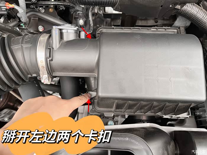 掰开左边那两个银色的卡扣,之后得用双手把空气滤盒子往左边一推,就取下盖子了。这是双手操作,就不方便拍照了。