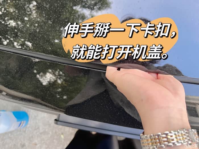 用小手往机盖缝隙里一伸,找到机盖中间的锁扣,往旁边一推,机盖就自动慢慢升起来了。比我的锋范高级很多!