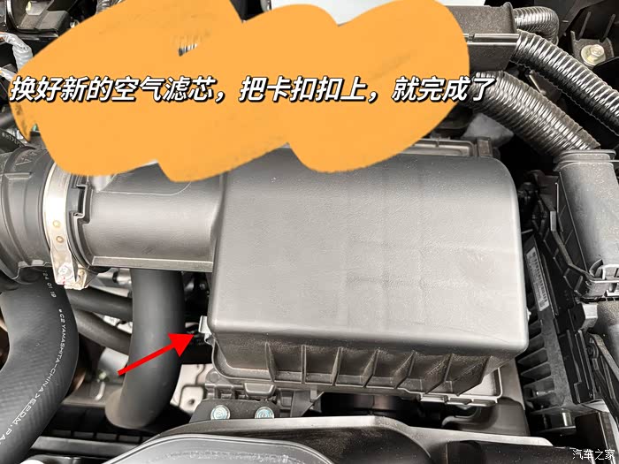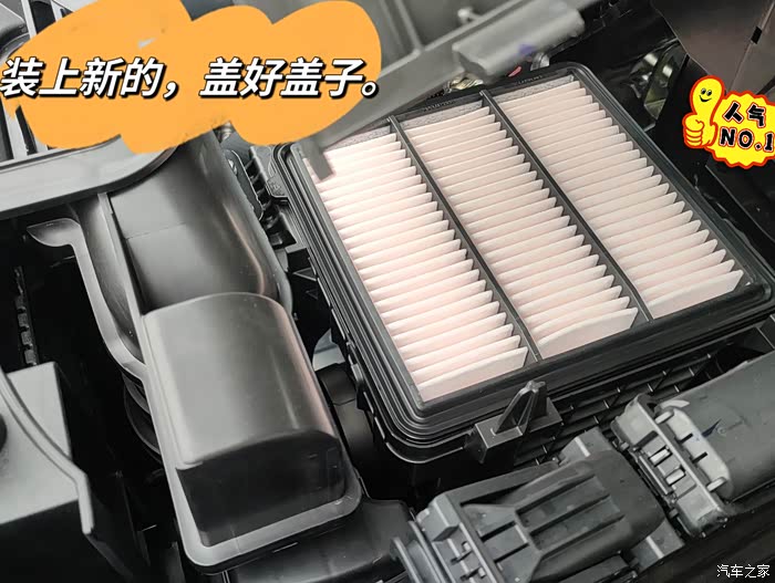 把新的空气滤芯装好,怎么取出旧的,就怎么装新的,然后按拆空滤盒子的反流程复位,就搞定了。