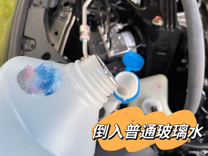 先倒入去油膜浓缩雨刮精。