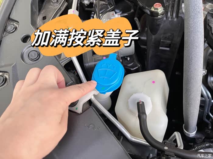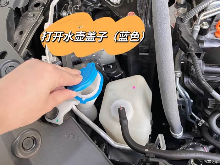 玻璃水壶是在副驾驶对出来的位置,蓝色盖子,上面有个喷水的标志。千万不要认错了,之前有车友把旁边的冷却液副水箱当成了玻璃水壶,这可危险的呢。