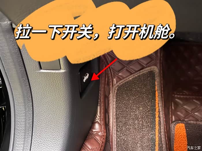 打开驾驶室车门,低头找到左边那个开关,一拉就会松开机舱盖锁扣,会弹开一点缝隙。