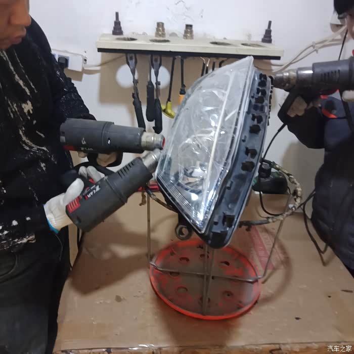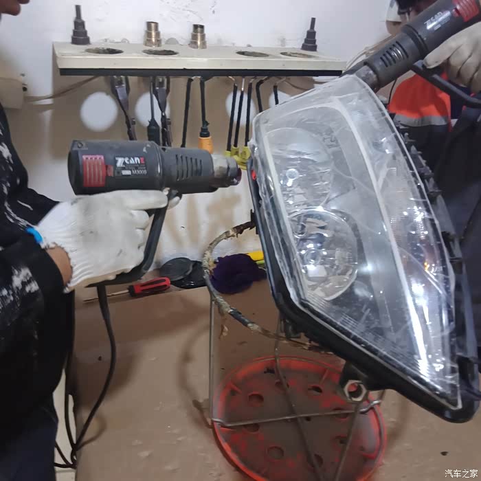 我问师傅怎么不用进烤箱,师傅说那样车灯灯罩老化的快。这样开灯挺快的,除胶看师傅也挺细心,拿小刀一点一点的割,又用钳子一点一点的夹。