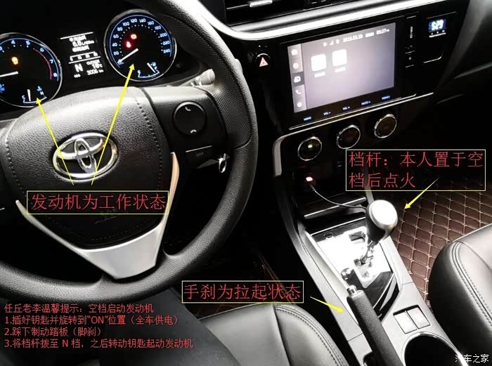 4.汽车状态:手刹拉起→档杆置于P档→点火(钥匙转动至START,启动汽车发动机)