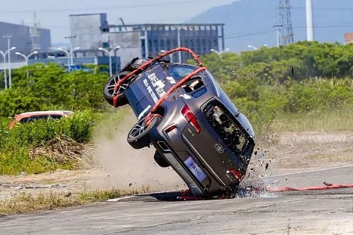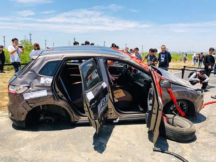 除了轮子掉落,车身A/B/C柱均没有发生变形,事故后车门依然能正常开启,这才是厉害的地方。