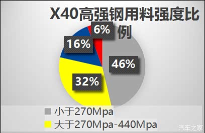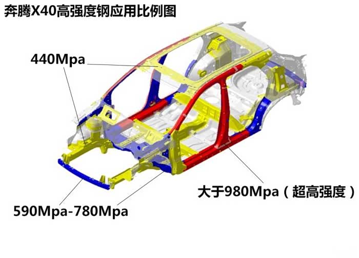 从这张图你就可以知道,奔腾X40的超高强度钢占比达到了20%。(世界各国对高强钢/超高强钢的强度要求略不同,但最高标准超高强钢为大于600Mpa,只要大于这个数值的都是超钢)