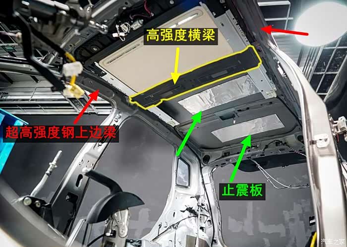 骨架能保持完好,主要就是看骨架的结构和钢材用料了,两者缺一不可。虽然奔腾X40[奔腾X40]没有全景天窗,但也给它的车顶预留布置加强件留下了空间。黄色的横梁就是采用了高强度钢,配合左右两边的超高强度钢材的上边梁,铸就了抗压的车顶。绿色箭头指的是止震板,如果你的车顶下雨天,雨滴击打很大声的话,说明这个没有贴。