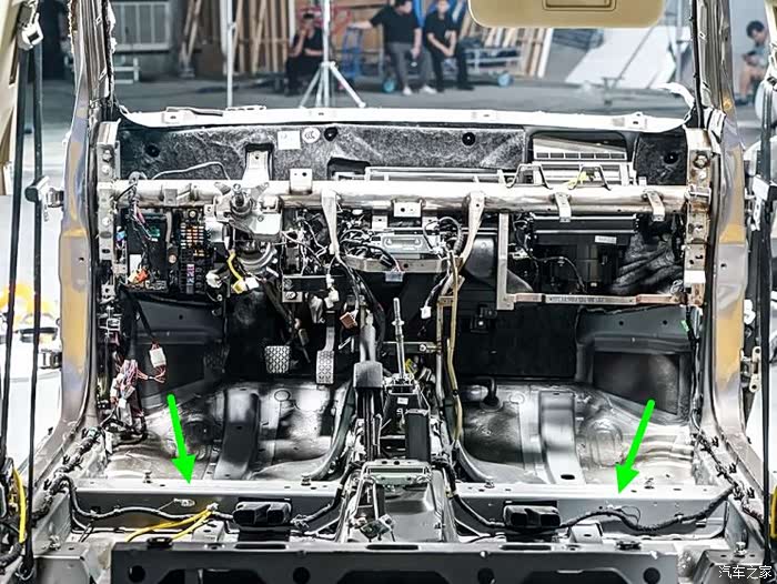 看到防火墙位置的这根粗壮钢管了没,可以说是车内的顶梁柱了。如果侧面受到撞击,没有它直接就凹进来伤及车内人员了。绿箭头标识的地板横梁也是高强度钢材。