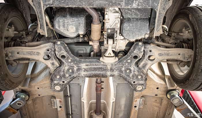 非全框式的副车架,这个车没有装发动机下护板,我走河滩的时候最怕搞爆油底壳了。不过这个是冲压铁质件,如果像铝合金一碰就碎,那更加担惊受怕了。所以,新车买回去一定要装护板。