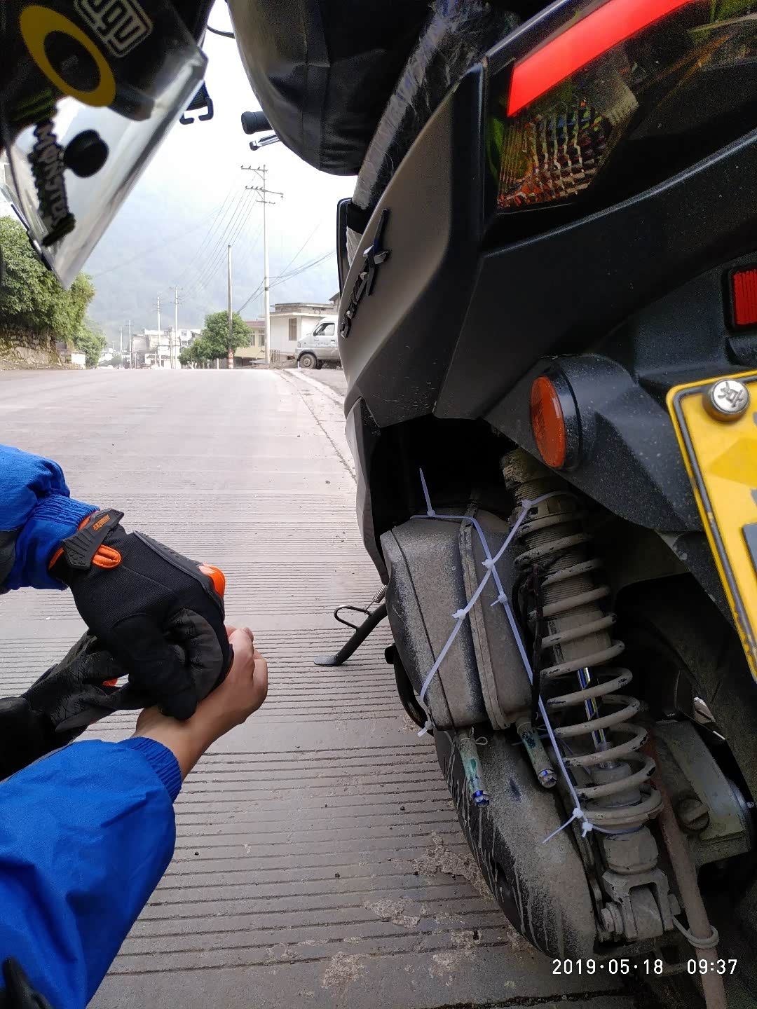 旅途中一般都会遇到一点挫折,比如,鸭子的固定空滤的螺丝位置,在过坑的时候被剧烈的冲击力抖断。暂时用扎带固定。所以,路况不确定的时候尽量放慢速度。