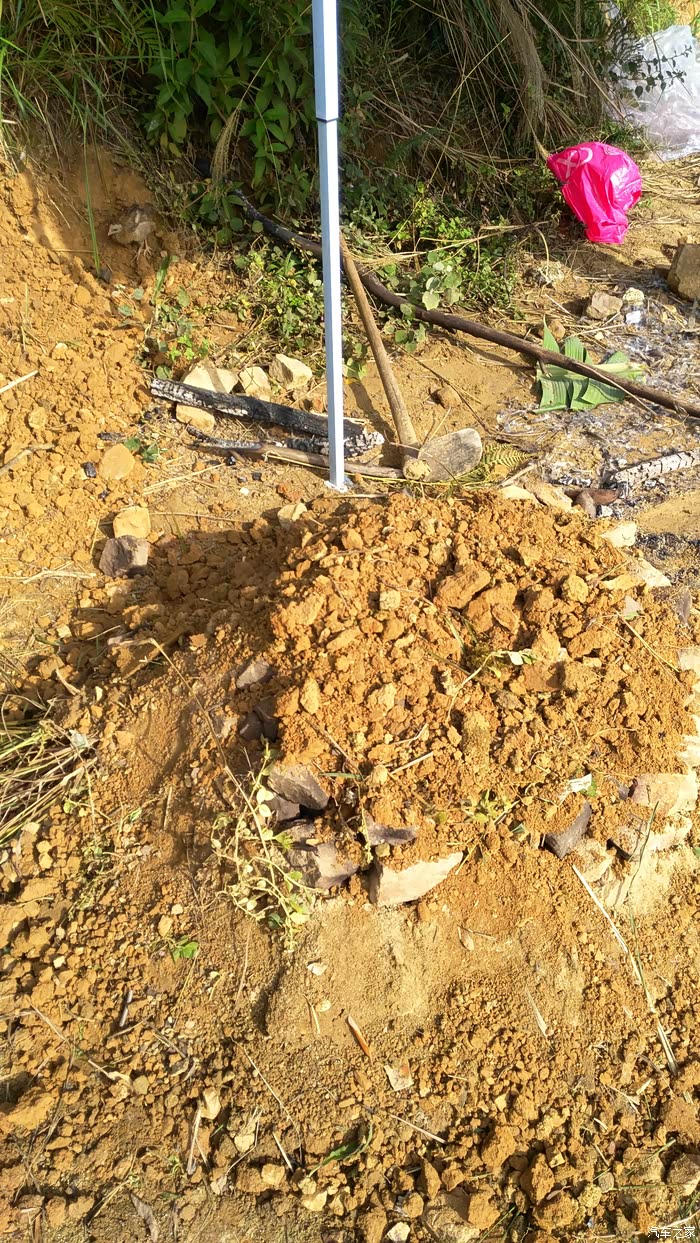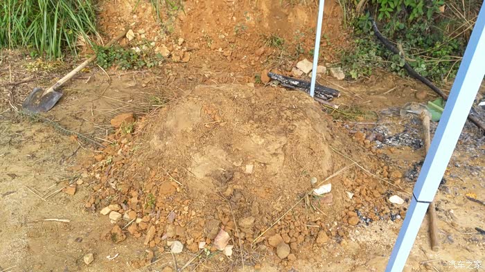 看到冒气了说明温度跟食材起到了作用,再对冒气部位继续填土用铲子拍打结实·