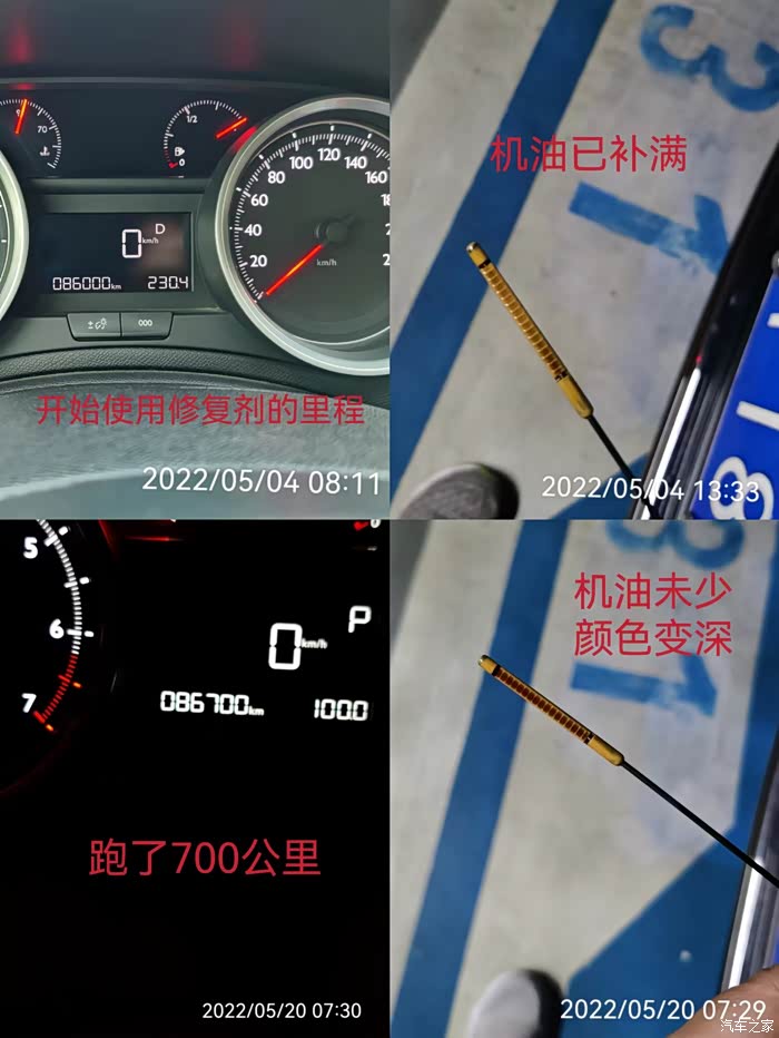 早上冷车检查,机油未少。但是有股汽油味,应该是修复剂渗透到活塞环清理积碳后,部分含有修复剂的汽油渗到机油里面了,所以机油一直显示未少。