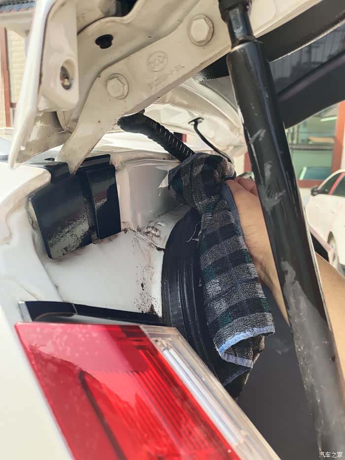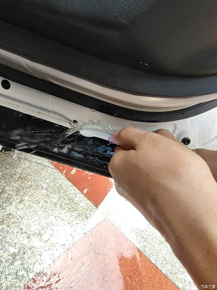 第三步,用刷子清除小缝隙和犄角旮旯的地方常年堆积沉淀的各种积物。重点是后备箱打开门上面、各种缝隙间、四个门框、踏板等处。