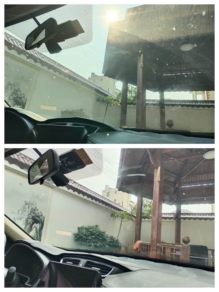 前挡风玻璃清洗前后对比,上为清洗前,下为清洗后