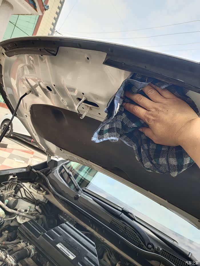第六步,擦拭发动机引擎。发动机引擎内堆积很多,不过都是灰尘,这里我不是很懂,不敢用清水重新,只用湿毛巾擦拭,去除各种灰尘即可。注意发动机不能是热的,冷却的擦拭了对发动机没有影响,也不会烫到。引擎盖底面也有很多脏东西需要进行擦拭。