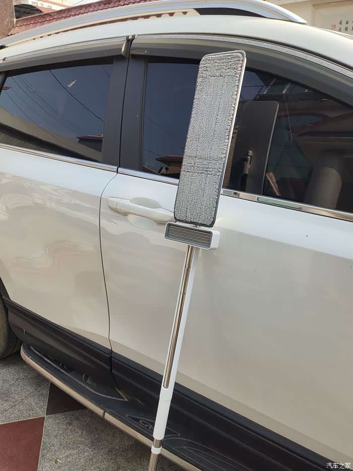 本田车有点高,有好几处,爬到轮胎上都够不到的地方。恰好家里有一个新的拖把,先用在车上。