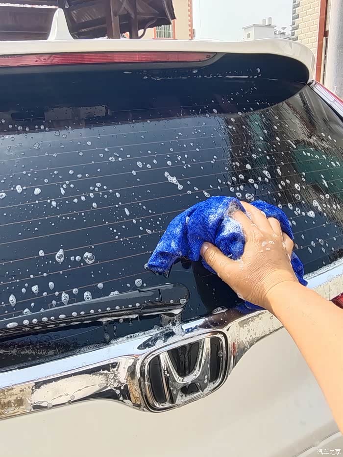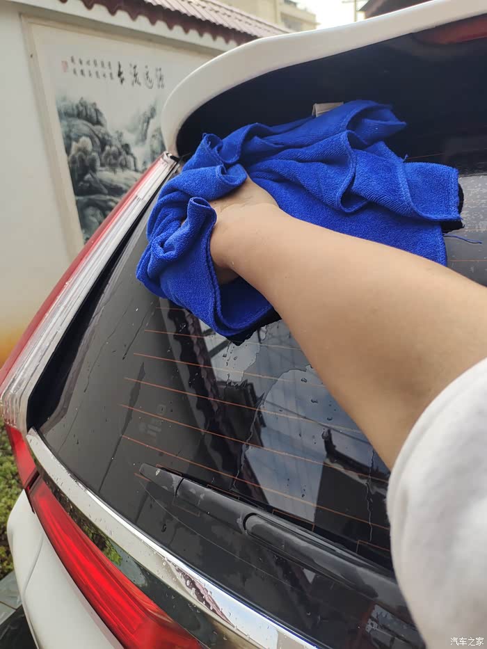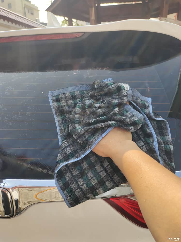 第二步,毛巾初步擦洗。水冲不掉的以及一些鸟粪虫子分泌物用毛巾轻轻擦洗掉。平时简单洗也基本就只是到一步。这里要注意,先轻擦再重,如果有硬东西,要注意从抹布上拿掉。避免划伤车身。