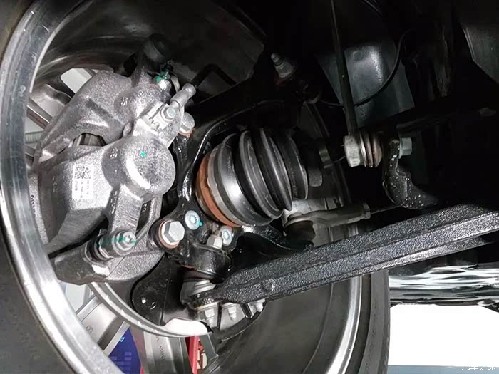 不过有意思的是,前悬架的无论是下摆臂、横拉杆、还是连接盘都是铁的,而后悬架的连接盘则是铝合金的,有些令人意外。