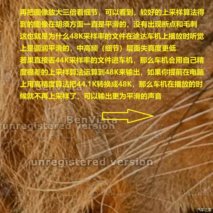 也就是说,途达车机锁定了发送给音频DAC/CODEC 的信号锁定在了48K采样率,如果你直接丢44.1K音频文件进去,那么他会调用车机运算性能较差的ARM CPU 通过一个很简单的算法来实现 44.1K 到 48K 的转换,精度很差,会产生很多的毛刺和断层(音频领域叫做谐波失真,简称TND)